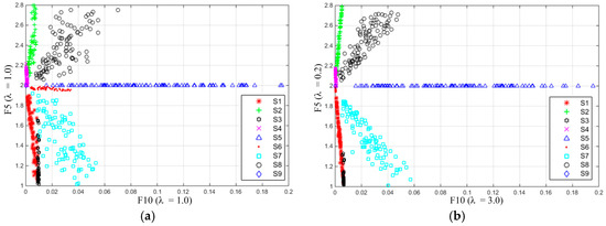 Figure 6 shows distributions of F5 & F7 of signals S1–S9. Figure 6a is the distribution obtained with both λF5 and λF7 taking a value of 1.0, which is the case of the features extracted from traditional S-transform. It shows that there is obvious overlapping between areas taken by S1, S3, and S7, respectively. Also, the areas taken by S2 and S8 respectively are too close to be easily separated. This will reduce the accuracy of classification algorithm. For comparison, Figure 6b shows the results obtained with λF5 = 0.2 and λF7 = 3.0, determined per discussion above. It can be seen that areas taken by S1, S3, and S7 are nicely separated, and there appears a clear space between areas taken by S2 and S8. Feature F7 is used to distinguish S1–S4 from S5–S6. Comparison between results obtained with λF7 = 1.0 and λF7 = 3.0, it can be seen the separation between S1–S4 and S5–S6 along the longitudinal axis (the direction of F7 axis) are much better in the case which λF7 is equal to 3.0.