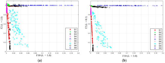 Figure 8 shows distributions of F10 & F2 of signals S1–S9. Feature F2 contributes to the separation of normal signal, sag, swell and interruption. The result in Figure 8a shows that, along the longitudinal axis (the direction of F2 axis), there is obvious overlapping between areas taken by S1 and S3, and also some overlapping between areas taken by S2 and S4 with λF10 = 1.0; the result in Figure 8b shows that areas taken by S1 and S3, S2 and S4 are nicely separated with λF10 = 3.0. Moreover, comparison between Figure 8a,b says the S7 can be nicely separated from other signals with λF10 = 3.0, λF2 = 0.1.