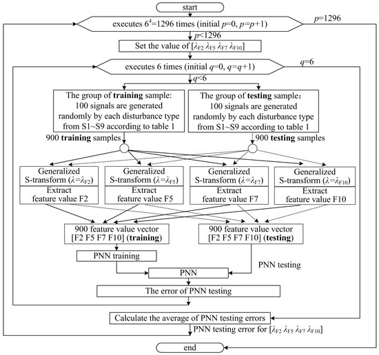 64 = 1296 combinations of width factor λF2 λF5 λF7 λF10, see the external loop of the flowchart in Figure 9, are examined, which are generated by assigning each element of [λF2 λF5 λF7 λF10] with 0.1, 0.3, 0.6 1.0, 2.0, and 3.0, respectively. For each width factor combination set [λF2 λF5 λF7 λF10]: (1) in PNN training, 900 samples of signals are used, which are obtained by randomly generating 100 signals for each of nine signal types; in PNN testing, similarly, 900 randomly generated samples of signals are used; (2) the feature vectors [F2 F5 F7 F10] are extracted from the 1800 samples of signals by using the S-transform with the corresponding width factor combination [λF2 λF5 λF7 λF10]; (3) the PNN are trained and tested with the feature vectors [F2 F5 F7 F10] (900 for training; 900 for testing), and the classification error for the corresponding width factor combination [λF2 λF5 λF7 λF10] is evaluated.