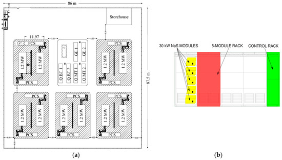 The controlled parameters are the module temperature, the dc-side current and voltage. The battery status is calculated from these basic parameters. Other BMS functions include: detection of alarms, warnings and battery capacity limitation signals; Control interface with PCS and data logging. The frame is of galvanized steel. The frame thickness is at least 2.3 mm both on lateral sides and on the covering. The dimensions (in meters) are 9.410 length × 4.800 depth × 4.820 height. It is worth noting that the standard NGK unit had five modules of 50 kW per rack (i.e., 250 kW per rack) whereas in the Italian installations five modules of 30 kW (150 kW per rack) have been employed: this gives greater spacing between modules. The Terna assembly is also equipped with a double redundant fire and gas detection system: the first is based on SO2 detection (in extremely remote case of fire and cell breaking), the second is based on ventilation system continuous air analysis that can detect the possible presence of smoke. Figure 2 shows some photographs of the energy intensive installation in Ginestra.