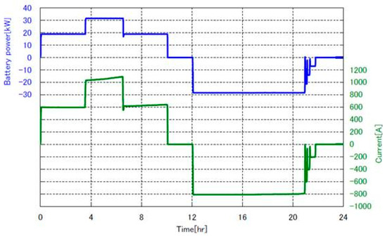 - a charge phase of 10 h where a constant charge power of 1 p.u. for 8 h after which a supplementary charge (as already mentioned in Section 4) is needed in order to reach 100% of SoC.