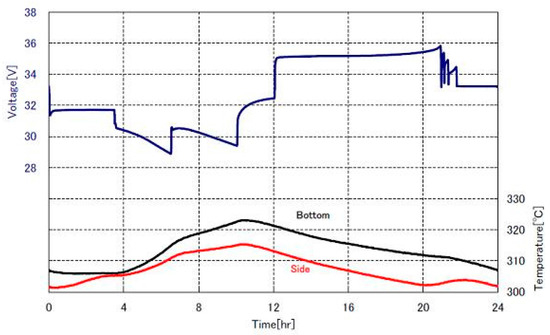 In Figure 9, the voltage and temperature inside a module are shown with reference to the standard cycle shown in Figure 8. With regard to the transient conditions, Figure 10 shows the inversion of the power flow from discharge to charge. It is worth noting that power inversion occurs in about 150 ms which is fully suitable for energy intensive stationary installations in the HV grid. The inversion from charge to discharge has a very similar behaviour.