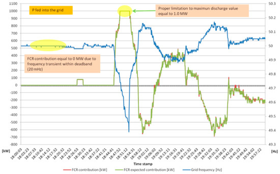 With reference to the Storage Lab installed in Sardinia, an operational data diagram focusing on FCR regulation triggered by the occurrence of a deep frequency transient is shown (see Figure 11). Table 5 and Table 6 report the technical datasheet of the EESS devoted to FCR regulation and its configuration, respectively.