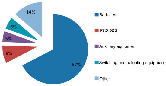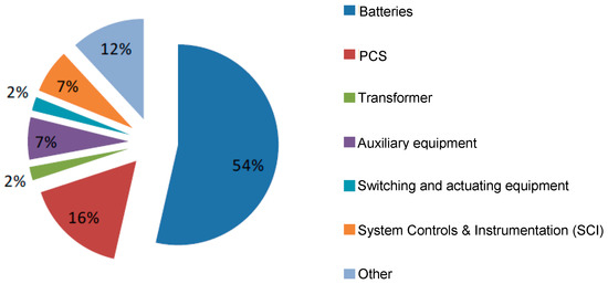 In order to have a comparison between the different cost components of the battery installations [27], Figure 12, Figure 13 and Figure 14 present the cost pie charts of Li-ion, Na-NiCl2, and Na-S respectively. The average total cost of Li-ion installations is 1.3 M€/MW and by considering an average discharge time for this technology equal to 1 h, the cost per MWh is 1.3 M€/MWh. The average total cost of Na-NiCl2 installations is 3.0 M€/MW and by considering the nominal discharge time for this technology equal to 3 h, the cost per MWh is 1.0 M€/MWh. The average total cost of Na-S installations is 3.3 M€/MW and by considering the nominal discharge time for this technology equal to 7.2 h, the cost per MWh is 0.46 M€/MWh.