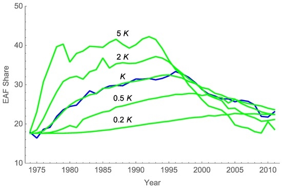 This section shows how the historical evolution of the diffusion of EAF technology in one country is affected by different values of the ratio L2/K. The blue curve of Figure 1 corresponds to the historical share of EAF in Japan. The green curve labelled with “K” is the best adjustment obtained with the approach of Section 2.1, that is, solving Equation (5), in which Equations (3) and (4) are embedded. This curve agrees quite well with the observed values (as proved by a MAE of 0.61%). The remaining curves show the effect of different values of K in Equation (3).