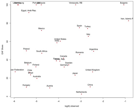 Observed values of the parameter K and share of the EAF technology in 2011.