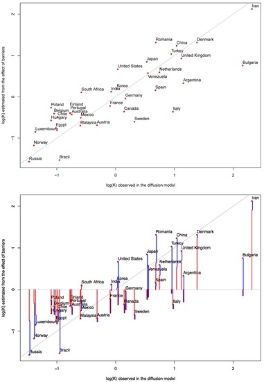 Section 3 of this paper explores whether or not we are able to find a relationship among the observed parameter K and some other parameters that can serve as a proxy of the barriers to the diffusion of innovations. Recall that the observed value of parameter K of the diffusion model measures the traits of the society that influence the diffusion of the innovation. In this task, although we are able to produce some interesting results, we faced some challenges. The first of them is that the dependent variable (parameter K) is the result of an optimisation problem (Equation (5)), i.e., although it allows some good adjustments between the diffusion of the technology and the observed values, it is not exempt from uncertainties. The second, and more daunting challenge, is that the number of countries (observations of parameter K or dependent variable) is much lower than the number of parameters that could serve as a proxy for some barriers, a problem worsened if we also include the inverses of those parameters and all potential interactions. Furthermore, we also have to deal with the fact that our collection of countries produces many atypical and leverage observations in some of the explanatory or independent variables. The outliers are not always in the same countries. The presence of outliers can be mitigated by applying transformations, and when the transformation proves useless, by disregarding the independent variable of the analysis. In order to avoid problems related to multicollinearity, we also disregarded independent variables highly related to others. Thanks to recent advances in statistical methods [41,45] (developed in the scope of machine learning and data mining) there are ways (using the cross-validation error) to overcome the risk of overfitting the model when there are more potential explanatory variables than observations.