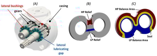 (A) Illustration of lubricating interfaces between the lateral bushings and gears in EGMs. Common designs of lateral bushings include pressure plates as represented in this figure and a bearing block design which also includes structural support to the shaft; (B) Relief grooves are highlighted in the side of the lateral bushing facing the gears; (C) Representation of HP and LP balance areas separated by a seal on the side of the lateral bushing facing away from the gears.