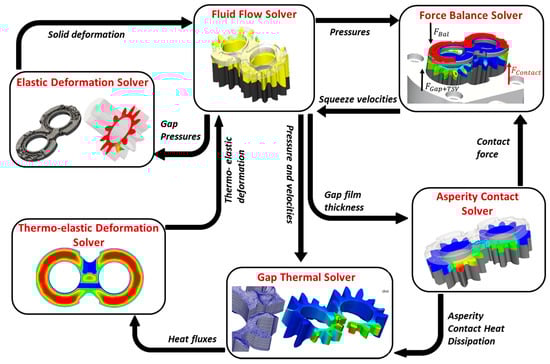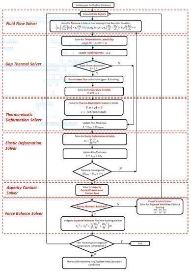 A flowchart representing the iterative scheme adopted for solving and coupling the different sub-models outlined in the mixed-TEHD gap model is shown in Figure 8. An initial guess for the film thickness at the three points pictured in Figure 5 is made at the beginning of the algorithm. Using the film thickness distribution in the computational domain, the various flow factors required to implement the mixed film model are evaluated using the non-dimensional relationships which are obtained from the works of Patir and Cheng [17,18] and Wu and Zheng [19]. Subsequently, the average flow Reynolds equation is solved to obtain the average pressure in the gap. This allows the evaluation of the velocity fields in the gap and thus, by solving the energy equation in the 3D fluid mesh, the temperature in the lateral gap can be obtained, using which the fluid properties can be updated. Since the thermal effects do not vary as dynamically as the structural effects for the present case, the deformation of the solids due to these effects are evaluated only every revolution. In these steps, the temperature fields in the gap are used to evaluate the resultant heat fluxes at the lateral bushings and the gears. Subsequently, the thermo-elastic deformation of the solids is evaluated after solving the applied temperature on the solids through the diffusion equation. This deformation loop is performed iteratively until a converged pressure is achieved according to a preset criterion.