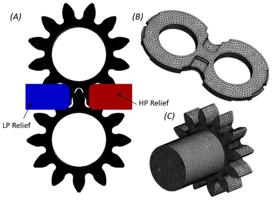 Representation of the various meshes used in the study (A) Fluid mesh along with the relief grooves (~120,000 cells); (B) Lateral bushing mesh (~40,000 cells); (C) Gears mesh (~50,000 cells).