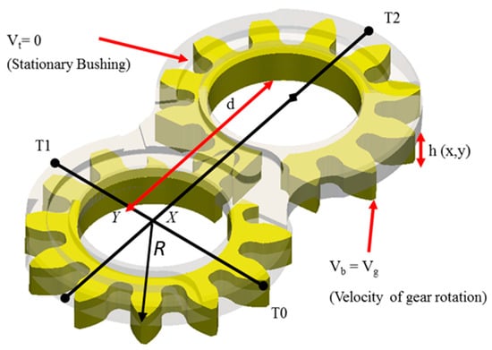The lubricating gap geometry (shown in Figure 5) in an undeformed two dimensional XY plane on the lateral gap domain and can be fully defined with the help of the coordinates of the three points T0, T1 and T2. Thus, the following equation can be derived to describe the gap heights at any given point in the computational domain Zecchi et al. [5]: