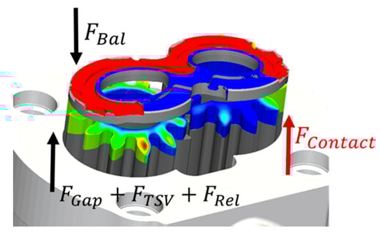 The force balance solver in the mixed-TEHD model evaluates the hydrodynamic effects on the lateral bushing by solving the force and moment equilibrium conditions (Dhar [7]). Forces on the bushing primarily originate from various sources of pressure, as represented in Figure 6. The forces directed away the gears are given by: the contribution of the pressures acting on the HP and LP relief grooves , the forces due to the pressures of all the tooth space volumes (TSVs), , and the forces given by the pressure distribution in the lateral gap . According to the pressure compensation principle of the EGM, these forces are compensated by the force acting on the balance areas , in the opposite direction with respect to the previous forces. Both and are calculated from the pressures evaluated from the fluid dynamic model of HYGESim (Figure 2), and used as boundary conditions for the gap model. The formulation and implementation of these forces in the solver is similar to the full film lateral gap model which was earlier presented in Dhar and Vacca [9].