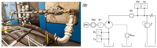 (A) Setup of the experimental test with the special prototype EGM and a graduated cylinder for measuring drain leakages. The drain leakages from the pump flow through the pipe connection leading to the measuring cylinder as shown in the figure; (B) ISO standard hydraulic circuit of the experimental setup used for measuring drain leakages.