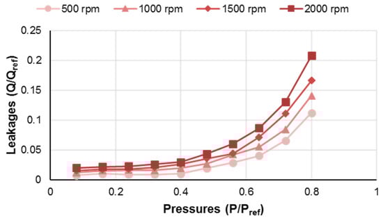 Experimental measurements were conducted for a range of operating pressures from to at different operating speeds of 500, 1000, 1500 and 2000 rpm. It must be noted here that a higher number of operating conditions were considered for the present study when compared to the former work in Dhar and Vacca [8]. Figure 12 shows the measured drain leakages plotted against the delivery pressures for all the tested operating speeds. It is observed that there is a strong tendency of leakages with the pressures as they increase steadily at higher pressures. However, there is only a marginal increase in the leakages with increasing speed. The values of leakages and pressures have been normalized for the sake of confidentiality with and .