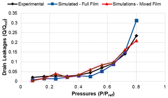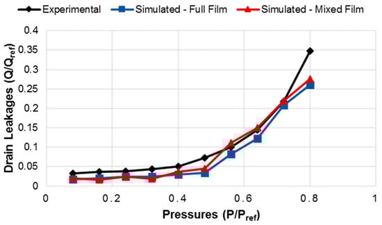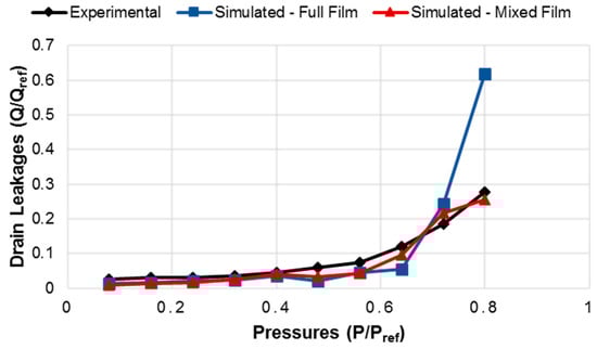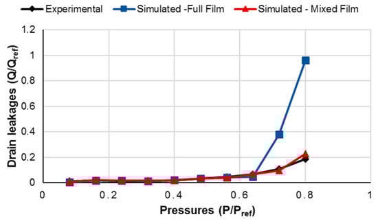 Comparison of measured drain leakages with the simulated ones from the full and mixed film models at an operating speed of 1000 rpm.