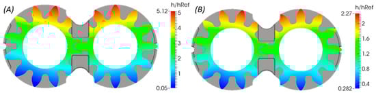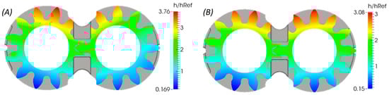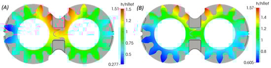 The average flow Reynolds equation evaluates the average pressure in the lateral lubricating domain based on the film thickness distribution, composite surface features of both the gears and the lateral bushings and the sliding velocities of the gears. The original form of the average flow Reynolds equation was modified for the case of EGMs, to incorporate the deformation effects of both the participating surfaces (Dhar and Vacca [8]) and by considering the differential relationship between gap compliance () and local film thickness introduced by Wu and Zheng [19] as shown in Equation (3). In this equation, represents the pressure flow factor, is the contact factor and indicates the shear factor which were introduced in the works of Patir and Cheng [17,18] and Wu and Zheng [19] to model the influence of surface features on the lubricant flow through the gap: