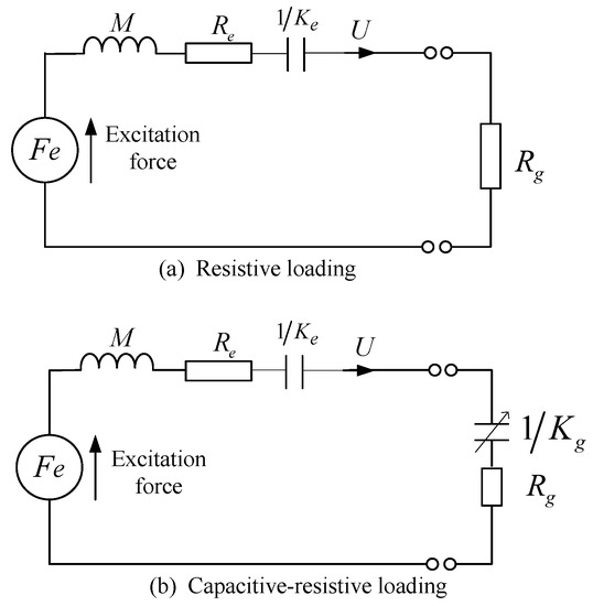The load impedance seen by a LWEC depends upon the control strategy of the generator, which can be purely resistive or can present some capacitive reactance to cancel that of the energy harvesting system. The resistive and capacitive-resistive loadings are represented in Figure 3a,b, respectively. A linear system could output maximum power by damping the system in resonance [18]. In this approach, maximum power extraction takes place when the load damping equals the mechanical losses.