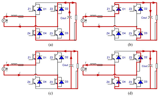 Current paths of AC/DC boost H-bridge (1 phase): (a) Z2 and Z4 switched on; (b) Z2 and Z4 switched off; (c) Z1 and Z3 switched on; and (d) Z1 and Z3 switched off.