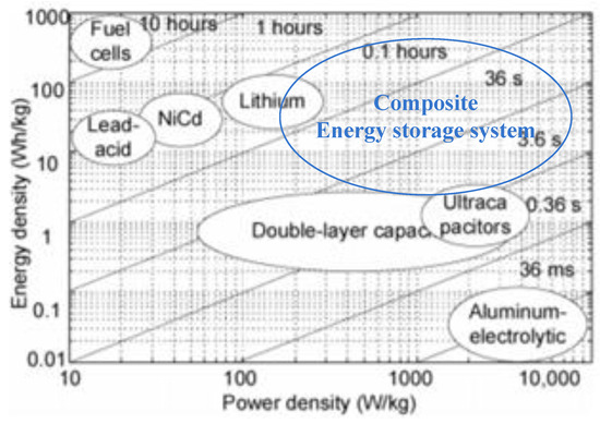 Diverse energy storage techniques are summarized in [29,30,31,32], and they have various relative disadvantages and advantages. Referring to Figure 6 [29,30,31,32], the advantages of super capacitors are summarized as having a high power density, high efficiency and tolerance to a large number of charging cycles. Comparatively, batteries are characterised as having a large energy capacity, but the number of charging cycles is limited and the power density is relatively low. Batteries are not suited to handling frequent fluctuations in power systems and devices with a high power density are more capable of handling frequent varying fluctuations in power systems.