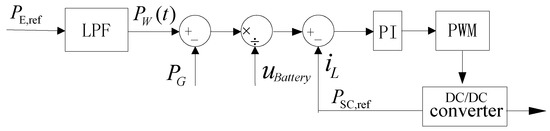 When is positive, the DC/DC converter is controlled to work in the buck mode as represented in Figure 7, and batteries absorb the excess power from LWECs. When is negative, the DC/DC converter is controlled to function in the boost mode, and batteries release energy to DC link, aiming to retain steady values of power output and DC link voltage. Figure 9 describes the controls of the interface circuit of batteries.