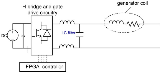 A power electronics-based wave energy emulator is capable of emulating the impedances, power losses and voltage waveforms reflecting the expected outputs of a particular LWEC, as proposed in [35]. This emulator could be used to excite power converters and the power train of LWECs for the assessment of performances over a range of conditions. Referring to Figure 10, each phase of the wave energy emulator consists of a DC supply, a low pass filter, a section of coils from a particular linear machine, an H-bridge inverter and related control circuitries. The H-bridge is controlled by signals produced from a field programmable gate array (FPGA) based controller with PWM methods [36,37,38]. The low pass filter is used to remove the high frequency PWM components from the output of the H-bridge.