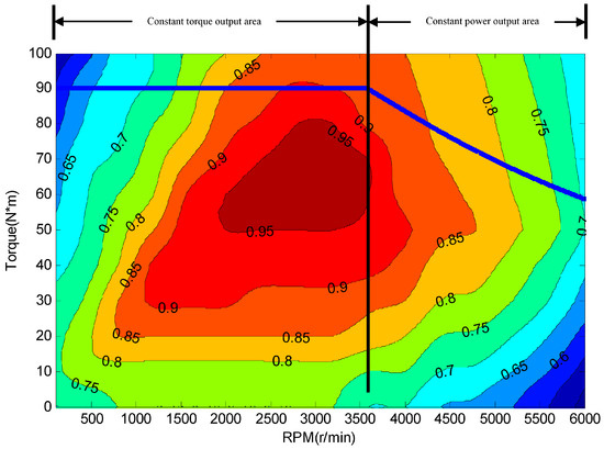 The relationship among the motor’s torque, RPM and efficiency is shown in Figure 2. It can be seen that the motor efficiency is quite distinguishing in different working regions and especially when it works in the low speed or low torque output region, the motor has poor efficiency.