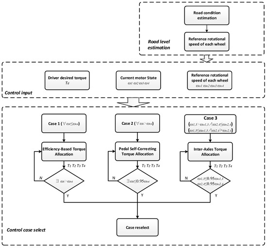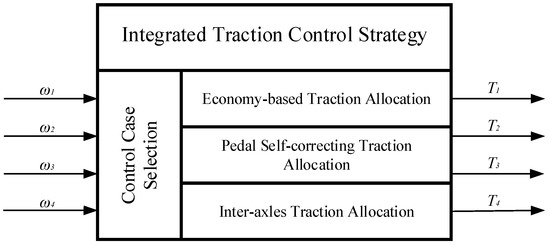 Under the premise of ensuring vehicle stability, its economy performance needs to be improved as much as possible, for EVs are developed to be a solution to the energy crisis. In order to achieve that, two traction control algorithms are discussed in the following subsections. One is for economy promotion, and the other is aimed at guaranteeing the vehicle longitudinal stability. Finally, to combine them together through three traction allocation cases, the integrated control strategy is introduced and its schematic is illustrated in Figure 3.