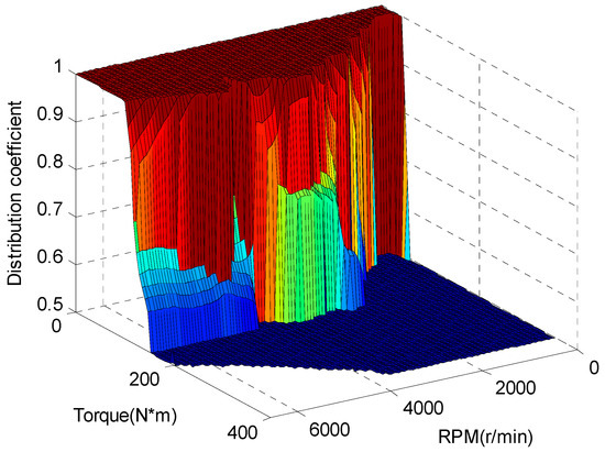 The objective function solution p is given as a two-dimensional lookup table with current desired driving torque and motor rotational speed, which can avoid numerous online calculations and meet system real-time requirements. The economy distribution coefficient p is shown in Figure 4.