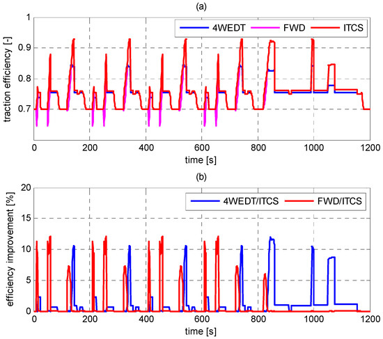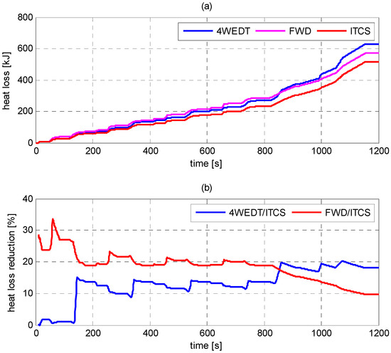 It can be seen from Figure 6 that vehicle traction efficiency is significantly improved after adopting ITCS. In some conditions, the improvement rate even reaches around 12%. Besides, as Figure 7 shows, the ITCS also achieves lower thermal loss than the others, which can reduce motor’s heat load and prolong its service life.