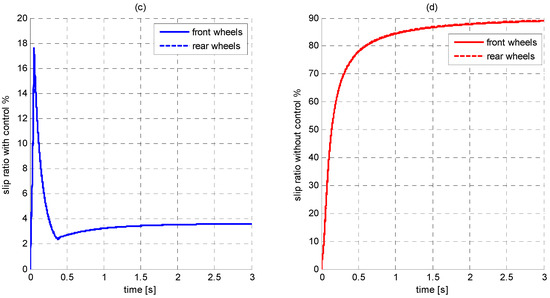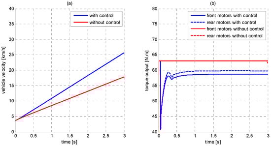 In this simulation, the accelerator pedal position is set at 95% opening. The tire/road friction coefficient equals to 0.3 corresponding to slippery cement pavement. The simulation results of even traction allocation (without control) and inter-axle traction allocation strategy (with control) are shown Figure 10. In Figure 10a, obviously during the whole time history, the velocity of the vehicle with inter-axles traction allocation is higher than that without control. That means the proposed strategy enhances the vehicle acceleration performance, which results from the improvement of the road traction utilization. As shown in Figure 10d, the tire with high vertical load always remains steady. The tire with low vertical load, however, seriously skids. Its slip ratio even reaches more than 80%. In contrast, Figure 10c clearly illustrates that the front wheel slip ratio with inter-axles traction allocation control reduces below optimal slip ratio 5.6% within 0.5 s and reaches the steady value within 2 s. It can be seen from Figure 10b that there is a 20 Nm fluctuation at simulation beginning, but the torque output stabilizes quickly after 0.5 s. At the end of the simulation, the torque reduction in Figure 10b is because the motor work point transfers from the constant torque area to constant power area.