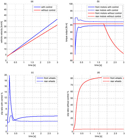 Simulation results of the vehicle with and without inter-axles traction allocation: (a) vehicle velocity; (b) motor torque output; (c) wheel slip ratio with inter-axles traction allocation; and (d) wheel slip ratio without control.