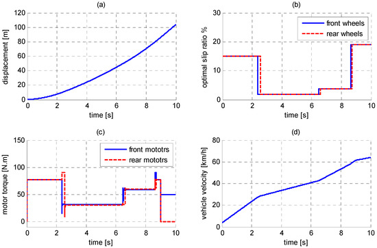 As shown in Figure 11, during the first 2.3 s, the car is running on a high adhesion road. The traction capacity provided by the road is much greater the driver desired torque. Therefore, Case 1 economy-based traction allocation is activated as shown in Figure 11g. According to current torque and RPM signals, the economy coefficient p is set as 0.5, which means even traction allocation is applied. Then, the front wheels move into the low adhesion area firstly and the rear wheels are still in the high adhesion area. The control case switches from Case 1 to Case 3 inter-axles traction allocation as shown in Figure 11g. Based on SMC, the torque output of front motors should be reduced to prevent the slip ratio from skidding. At the same time, the controller raises the rear motors output to ensure the vehicle dynamic performance to meet the driver’s demand as shown in Figure 11c. When all four wheels move into the low adhesion road, Case 2 pedal self-correcting traction allocation is activated. At about 6.4 s, the friction coefficient changes from 0.1 to 0.2, but Case 2 keeps running, since Case 2 is still satisfied. By the end of the simulation, the controller can estimate the optimal slip ratio correctly and choose appropriate control case. Furthermore, it should be noted that, after the accelerator pedal position decreases from 85% to 28% at the 8.9 s, Case 1 is still running, however the front and rear motors’ outputs are different the torque outputs from before. That is because through analysis of desired torque and RPM information, economy coefficient p is reset as 1, FWD mode, to make the vehicle achieve the optimal economy performance.