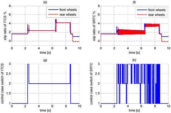 Meanwhile, the control results from a slip ratio tracking controller is also presented as comparison and named SRTC. It can be seen from Figure 11e–h that, in the high friction road condition, the performance of ITCS and SRTC is similar and Case 1 is activated correctly. However, on low and intermediate adhesion roads, the disturbance of the slip ratio calculation leads to the frequent switch between Case 2 and Case 3. It apparently has negative effect on the controller performance. The comparative results demonstrate that the proposed integrated control strategy is adaptive to different road conditions, can improve driving efficiency, and ensure vehicle and wheel stability.