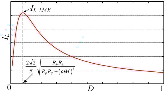 When Uin and M are fixed values, the relationship between D and IL is as shown in Figure 4. The parameters of SS compensation are shown in Table 1. It can be found that when the D is gradually increased, the IL first increases and then decreases, and the maximum value of IL is obtained when the critical value of Db is equal to that shown in Formula (6). RP is a relatively low value, thus the critical value of Db is very small. In a large range of Db < D < 1, the load current IL and duty cycle D present an approximate inverse proportion of the variation. The mode of the SS compensation cascade buck circuit is different from the typical buck converter, in which the relationship between IL and D is a monotone function. Therefore, the WPT system needs to be designed suitably, and then the Buck converter can be used with a dynamic changing input voltage and the constant output voltage/current is adjusted using the proportional integral (PI) control strategy []. However, for practical applications, the buck circuit is expected to have constant input voltage for reliable control.