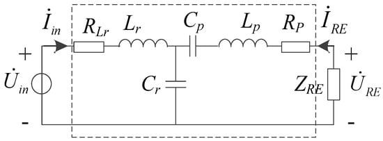 Next, the two-port network theory [] is introduced to analyze the equivalent circuit of the primary side, and the system has constant-voltage-source input as shown in Figure 7, where URE and IRE are the voltage and current of the reactance resistance.