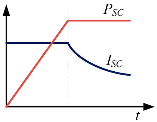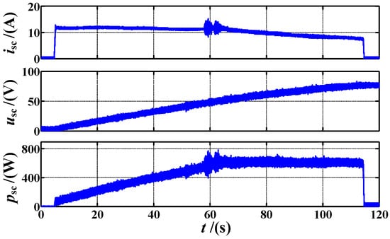 The supercapacitor charging process is as follows. First, constant current (ISC*) charging is performed until the supercapacitor voltage increases to the reference voltage (USC*), the ISC* is 12 A and the USC* is 50 V. Then, when the supercapacitor voltage is greater than USC*, the charging process changes to constant power charging, and the power reference PSC* is 600 W. The capacitance of the supercapacitor is 18 F.