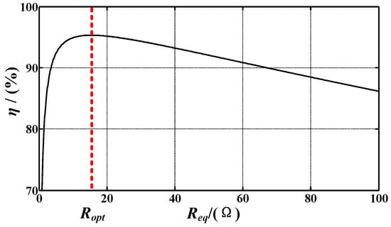 Considering the system parameters listed in Table 1, the relationship between η and Req is shown in Figure 11 according to (30). In the process of the equivalent load Req gradually increases. The system efficiency will first increase, then decrease, which is similar with the SS compensation mode. If the output equivalent resistance of the coupling coil is the optimal load Ropt, the system can maintain the efficient operation, namely Req = Ropt, and then the system achieves maximum efficiency.