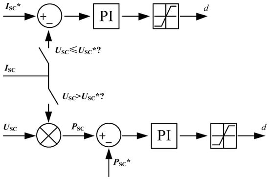 Based on the above analysis, an efficient charging strategy for the supercapacitor is designed combined with the WPT system, as shown in Figure 12. The supercapacitor voltage and current are detected in real time, and if the supercapacitor voltage USC is smaller than the reference voltage USC*, the buck circuit is controlled under the constant current charging model. When the super capacitor voltage USC is greater than the USC* instruction, then the product of the super capacitor voltage and current is calculated as the supercapacitor charging power, and the constant power reference PSC* is used to adjust the buck circuit duty cycle D to achieve constant power charging.