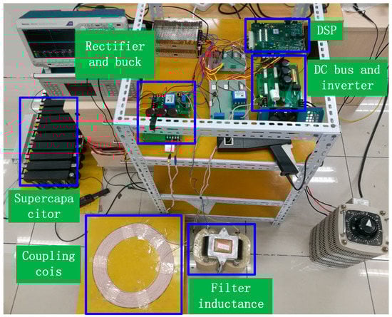 In order to verify the constant voltage characteristics of LCC compensation mode and feasibility of the proposed charging strategy, a WPT system experimental prototype is fabricated, and shown in Figure 13. The topology of the WPT system using SC as a load is similar to that shown in Figure 2, but the SS compensation is replaced by LCC compensation. The parameters are consistent with those in Table 2.