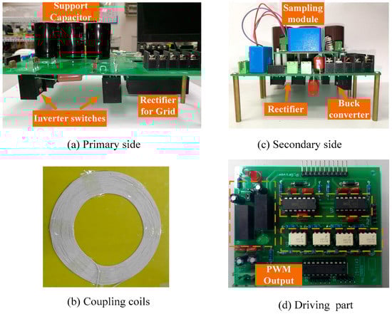 The SanRex three-phase bridge DF100AA160 (Osaka, Japan) is used to convert the grid alternating current (AC) to direct current (DC). CREE SiC MOSFET C2M0080120D (Durham, NC, USA) is adopted as the active switch of inverter (DC/AC) on the 58 kHz switching frequency. CREE SiC SBD C4D20120D (Durham, NC, USA) is used as the anti-parallel diode of the inverter (DC/AC) and the switch of the rectifier (AC/DC). The transmitter and receiver inductors are circular coils with a single layer and a turn number of 18, composed of tightly-wound litz wires with a diameter of 3 mm. The external diameter of coil is 40 cm and the gap between the transmitter and receiver is 15 cm. The inductor and capacitor are chosen under the resonance for both the transmitter and receiver, and the resonant frequency is same as the operating frequency for improving the efficiency and reducing the VA rating of the WPT system. The SC voltage, charging current, transmitter and receiver AC currents and voltages are tested using a Tektronic DPO3034 Digital Phosphor Oscilloscope (Beaverton, OR, USA). Based on the test results, the transmitting power, receiving power and transfer efficiency are calculated using MATLAB software according to the definition of power.