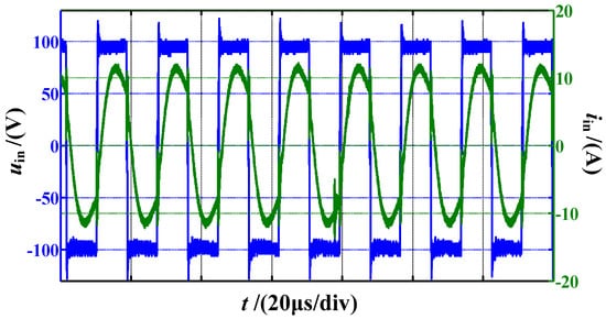 When supercapacitor charging adopts an efficient charging strategy, the inverter output voltage and current waveform are as shown in Figure 14 under the mode of the constant power. It can be seen that the phase of inverter output voltage is ahead of the current phase. This is because the above theoretical analysis is based on the fundamental waveform, however the output of the inverter is a square wave at three times and has higher harmonics, thus there is only a light phase difference of the voltage and current. This also enables the system to achieve zero voltage switching (ZVS).
