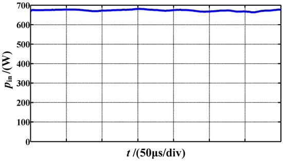 Figure 16 represents the waveforms of the supercapacitor charging current, charging voltage and charging power. The constant charging power is 593 W, which is essentially in agreement with reference power PSC*. According to the output voltage and current of the inverter as shown in the Figure 14, the inverter output active power (Pin) is obtained as shown in Figure 17. The constant power Pin is 675 W.