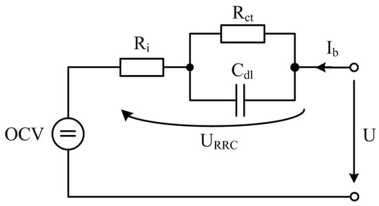 where U(s) is the battery terminal voltage, Ib(s) is the battery current with a negative value in the discharge state and a positive value in the charge state, and s is the frequency operator. The voltage URRC, which drops on the Ri and Rct–Cdl network, can be expressed in Equation (17) as follows: