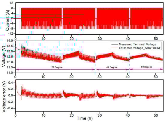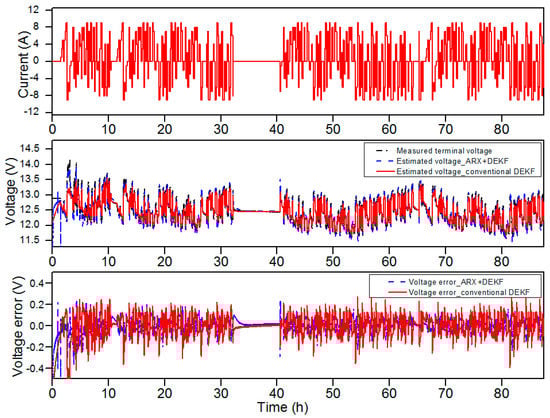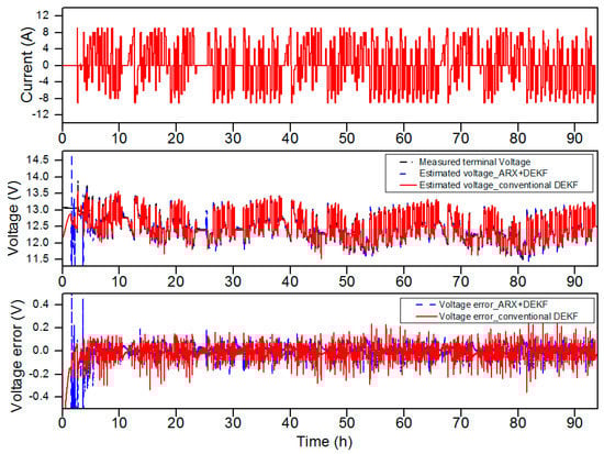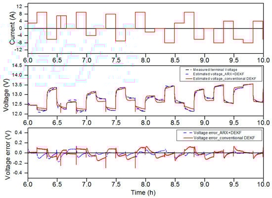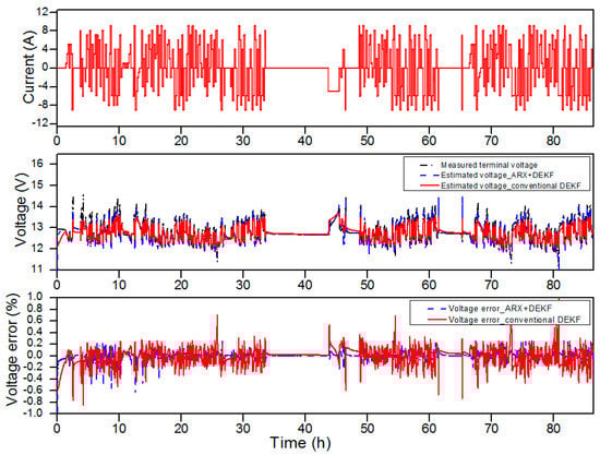 First, the estimation results obtained with the proposed algorithm for the battery having 98% of its nominal capacity (68.6 Ah) are shown in Figure 3, Figure 4 and Figure 5. The middle graph of Figure 3 shows a comparison of the measured and simulated battery voltages obtained with the proposed DEKF-ARX method, and the simulated voltage obtained with the conventional DEKF method. Meanwhile, the relative error between the voltages is shown in the lower graph as a function of time. As illustrated in the lower graph of Figure 3 and Figure 4, the voltage estimations obtained from the simulation shows that the DEKF-ARX method provides better results in terms of voltage estimation. The maximum voltage estimation error is about 0.1 V for the DEKF-ARX method, while it is more than 0.1 V in case of the conventional DEKF method.