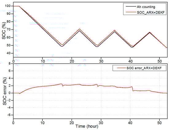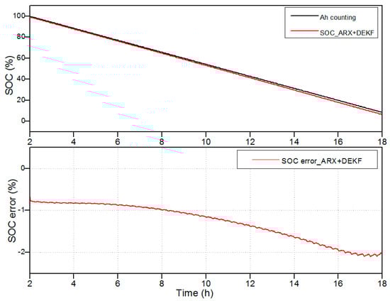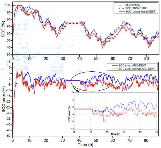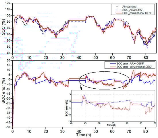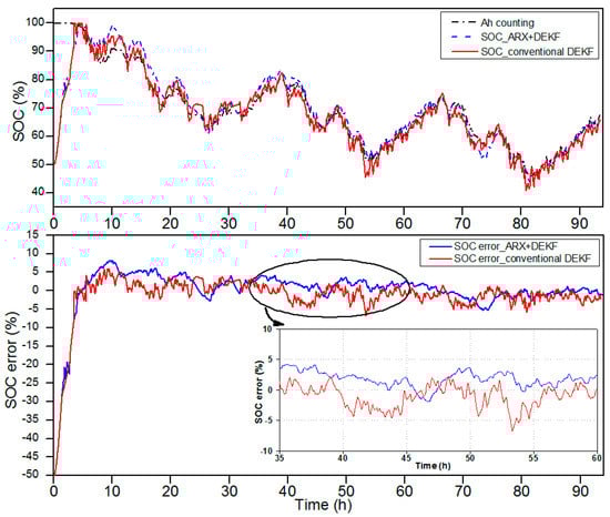 The upper graph of Figure 5 depicts a comparison between the simulated SOC by the DEKF-ARX method, the simulated SOC by the conventional DEKF method and the Coulomb counting reference profile, while the SOC estimation error in percentages for both methods are shown in the lower graph of Figure 4. The initialization of the estimated SOC was 50% instead of 100% to verify that the proposed algorithm converges to the true SOC value. After 10 h of operation, the SOC error is reduced to 8% and it remains less than 5% for the DEKF-ARX method. Meanwhile the SOC estimation error of the conventional DEKF method increases to 7%.