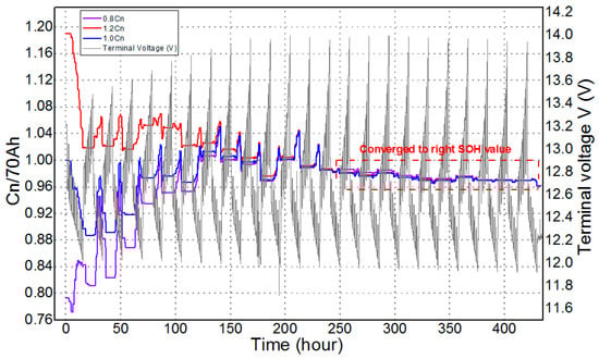 The battery capacity estimation by the DEKF-ARX method is shown in Figure 12. Again, three different initial capacity values (0.8 Cn, 0.6 Cn and 0.4 Cn) are used in this simulation. In all three cases, the estimated values of the capacity converge to the real capacity (0.596 Cn = 41.72 Ah) within an error range of 3% in a 250 h time duration. After convergence to the correct value, the SOH has a very small change which verifies the accuracy of the proposed method. Table 1 shows that the performance of proposed method is better in terms of the root mean square errors (RMSEs) of estimated voltage and SOC when compared to the conventional method without paramter estimation.