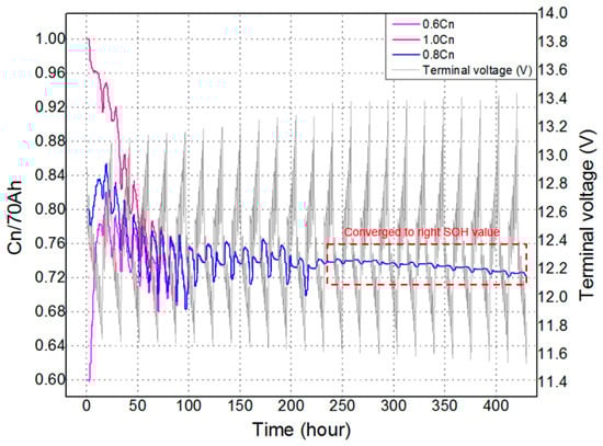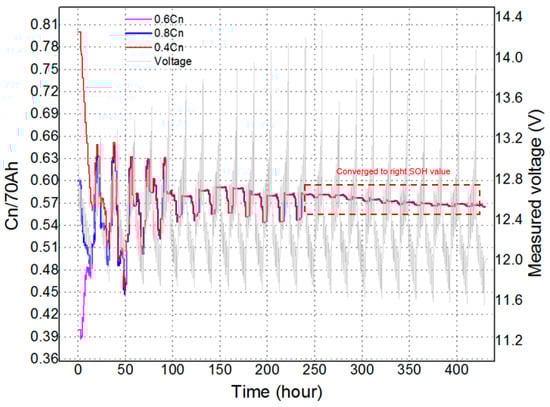 - To test the performance in estimating the SOH, three different initial values have been given to verify its convergence characteristics by using a 440 h test profile.