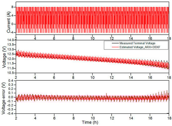 The estimation results obtained with the proposed algorithm for a battery with a 75.6% measured capacity are shown in Figure 7, Figure 8 and Figure 9. These results also demonstrate the improved estimation provided by the DEKF-ARX method.