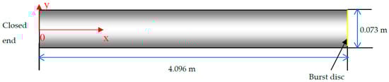 In nuclear safety analysis, the Edwards and O’Brien test [] represented a standard problem for the verification and assessment of computational programs [,]. It consisted of fluid depressurization studies in a horizontal straight pipe 4.096 m long with an inner diameter of 0.073 m; see Figure 1. One end of the pipe is a fixed wall, while at the other end, a glass disc was mounted, which was designed to burst to initiate the depressurization transient.
