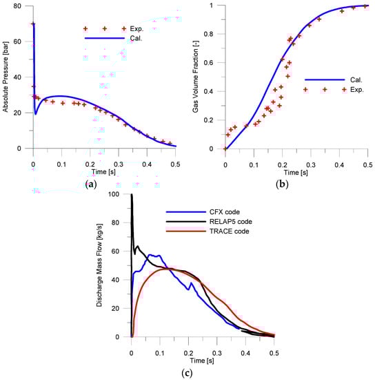 The discharged mass flow from the blowdown pipe is shown in Figure 2c below. Due to lack of experimental information, the results are compared with those obtained by two classical system codes, i.e., RELAP5 and TRACE, from the recent work []. One can see that the maximum value is reached shortly after the burst, where the difference between the codes is largest. According to RELAP5, the mass flow increases rapidly from 0 to 100 kg/s at the moment of the burst, while TRACE and CFX give a significantly lower maximum value with a delay around 0.1 s. In addition, the change of mass the flow rate with time delivered by CFX is much more gentle and smooth in comparison to that by RELAP5 and CFX.